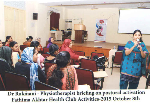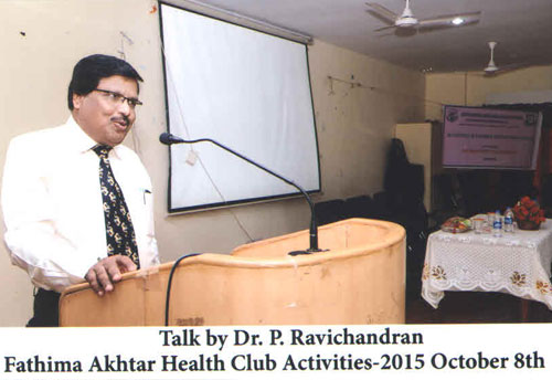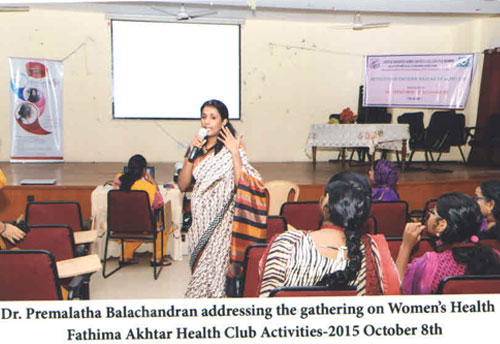 The activities of the Fathima Akhtar health club was formally inaugurated on 8th October 2015 by Dr.P. Ravichandran, Professor and Head, Department of Surgical Gastroenterology & Liver Transplantation, Govt. Stanley Medical College and Hospital, Chennai. It was followed by Awareness lecture on Women™s Health™ by Dr. Premalatha Balachandran, Gynaecologist and Obstertrician, Motherhood Hospital, Alwarpet,Chennai. Dr.Subhashini Mohan, Dermatologist, Motherhood Hospital enlightened the students on Skin Care and Mrs. Sowmya Binu, Senior Nutritionist, Motherhood Hospital spoke on Eating Healthy. An Interdepartmental poster presentation on Women and Wellness was also conducted and prizes were awarded to the best posters.