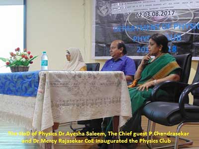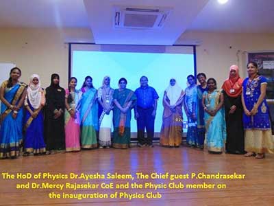The inauguration of the Physics Club for the academic year 2017-2018 was held on 2nd August 2017. The Chief guest Mr.P. Chandrasekar, Director-Finance-Associated with Piolax India Private limited delivered a special lecture on the topic “INTRODUCTION TO INTERPERSONAL SKILLS AND CAREER OPPORTUNITIESâ€. The office bearers of the Physics Club for the year 2017-2018 were presented with their badges. The Physics Club activity was held on 3rd August, 2017. Events like word scramble, memory capsule, pot pourri were conducted and prizes were awarded to the winners. The Valedictory function of Physics Club was held on 19th February 2018. The Chief guest for the function was Dr.Philominraj, former HOD of Physics, MCC, Chennai. The Chief Guest delivered an informative lecture on the working of nuclear reactor and on the concept of neutrino physics. The annual report of the Physics club for the year 2017-2018 was presented by the Club President Ms.Samreen Fathima.