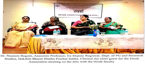 The Department of Hindi was Started with the Inception of the Institution in the year 1955 Under the Headship of Mrs. Rukmani followed by Mrs. Faridha Begum , Dr. R. Mumtaz joined the Department in 1972 and served the department for three decades, Dr.Sheerin Banu .J rendered her service for 8 years. The Department offers Part-1 Hindi to the B.A/B.Sc and B.com Students.